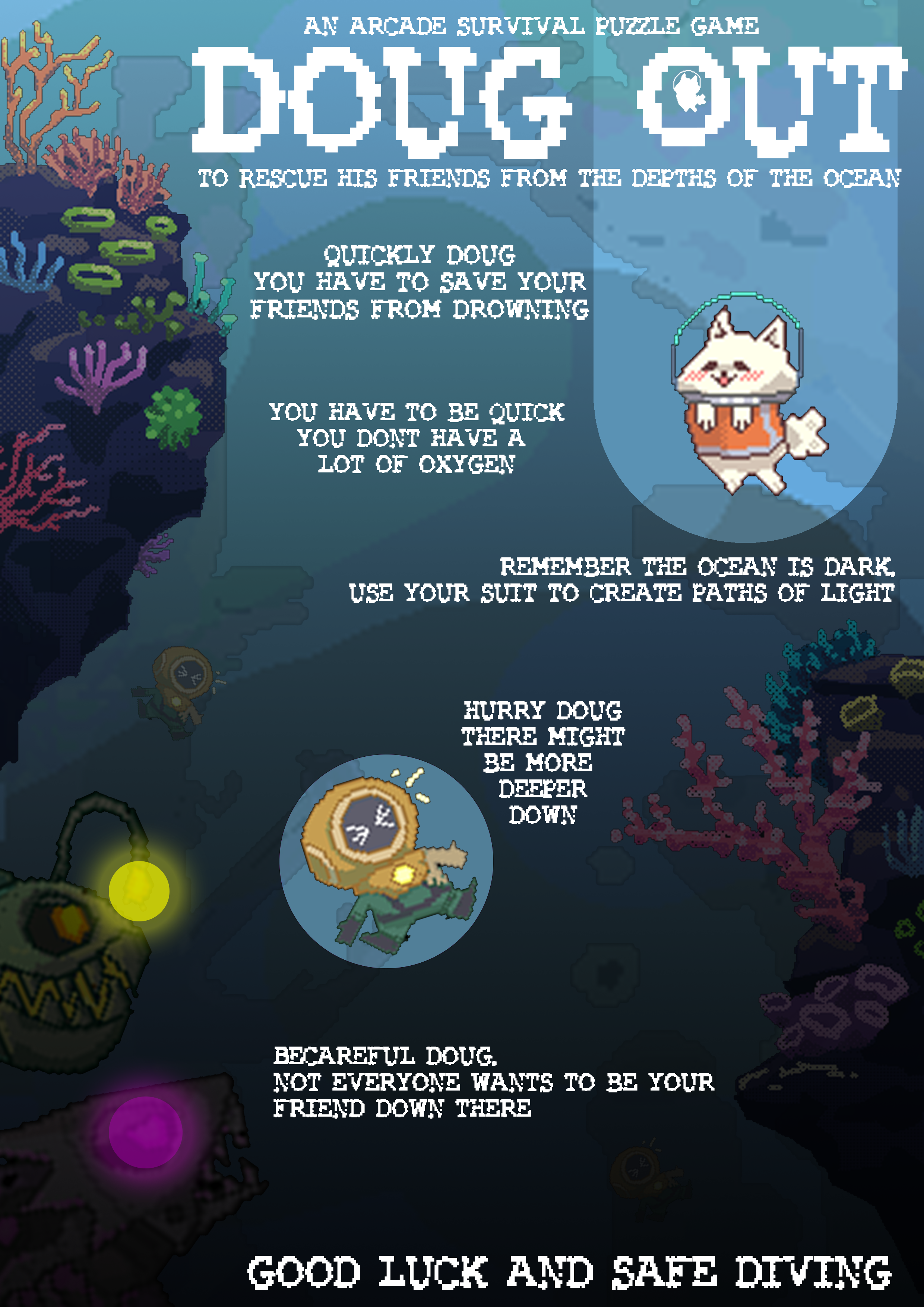 In Doug Out, a pixel-style game created during a rapid prototyping course, I worked as the concept artist. The game follows a brave little dog diving into the deep sea, dodging dangerous fish, and trying to rescue drowning divers.