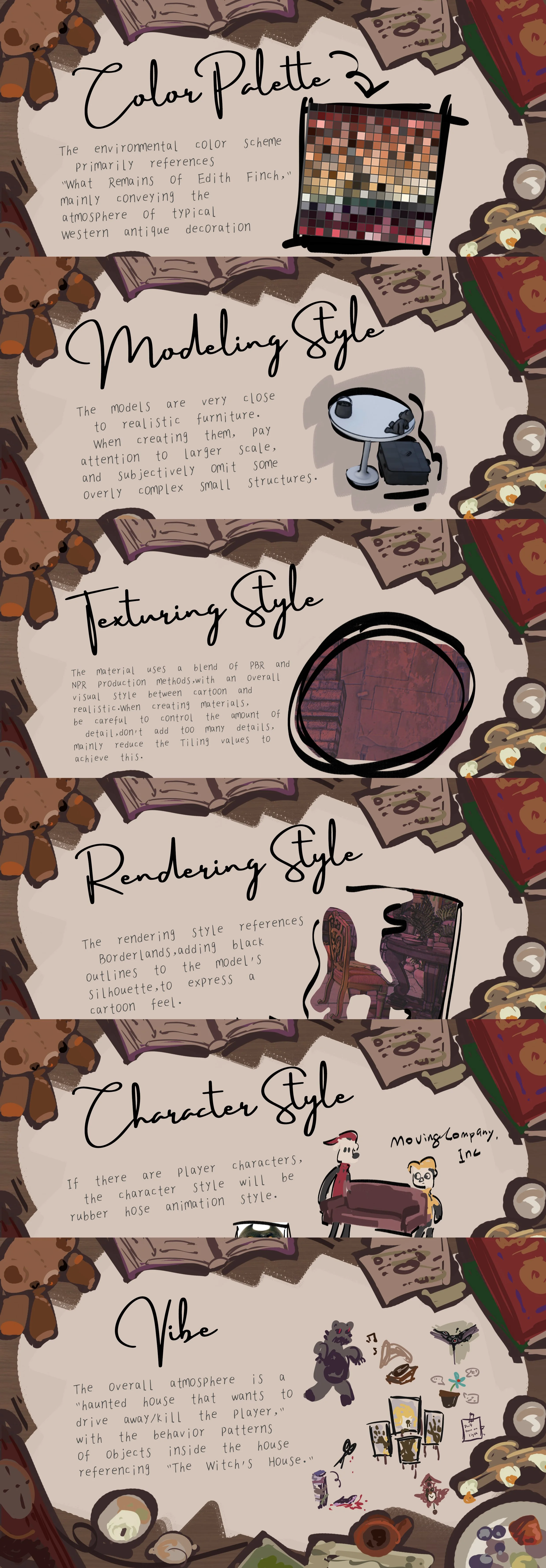 For the second version, I established a new concept of a magical haunted house war. I developed the visual style and elements for this direction, which was then adopted by the team. The uploaded style guide shows how I defined the color palette, modeling style, texturing, rendering approach, character style, and overall vibe.